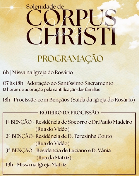 Corpus Christi, que significa “Corpo de Cristo” em latim, é uma festa religiosa da Igreja Católica que celebra a presença de Jesus Cristo na Eucaristia Acompanhe a programação deste dia de Corpus Christi em Barbalha……