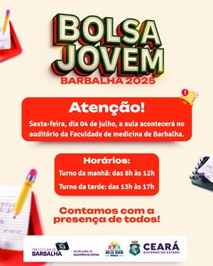 A Prefeitura de Barbalha, por meio da coordenação do programa Bolsa Jovem, promove nesta sexta-feira, 04 de julho, uma aula especial voltada aos participantes da iniciativa. O encontro acontecerá no auditório da Faculdade de Medicina de Barbalha, em dois turnos: das 8h às 12h e das 13h às 17h.
