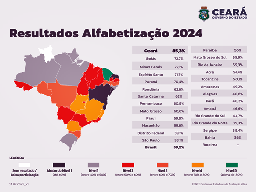 O Ceará, mais uma vez, supera a meta nacional e se mantém como o único estado brasileiro a alcançar 85% das crianças da rede pública alfabetizadas na idade certa em 2024. É o maior índice do País. No Brasil, 59,2% das crianças alcançaram o nível adequado de alfabetização, um avanço em relação a 2023 (56%). A meta nacional era de 60% para 2024. Os dados são do Indicador Criança Alfabetizada (ICA), divulgados pelo Ministério da Educação (MEC), nesta sexta-feira (11), em Brasília.