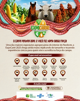 A Expo Cariri trará juntos agricultores de toda a área do Cariri e do Ceará, além de delegações de estados vizinhos. O encontro ocorrerá no Campo Experimental da Embrapa, situado na estrada que liga Barbalha a Missão Velha.