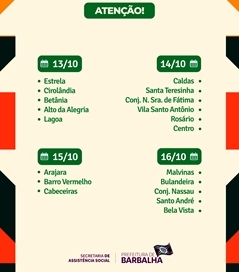 ● 16/10 – Malvinas, Bulandeira, Conjunto Nassau, Santo André e Bela Vista.