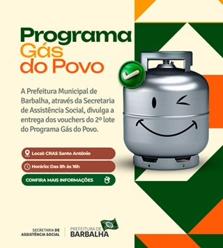 A Prefeitura Municipal de Barbalha, por meio da Secretaria de Assistência Social, dará início, nesta segunda-feira (13), à entrega dos vouchers do 2º lote do Programa Gás do Povo, benefício que assegura auxílio-gás às famílias em situação de vulnerabilidade social no município. As entregas ocorrerão das 8h às 16h, no CRAS Santo Antônio, seguindo cronograma dividido por bairros.