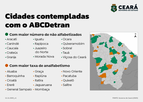 Os 29 municípios contemplados no ABCDetran foram escolhidos com base no número de pessoas não alfabetizadas e na taxa de analfabetismo de cada região. Além de Fortaleza, foram selecionados dois municípios de cada uma das 14 regiões administrativas do estado.