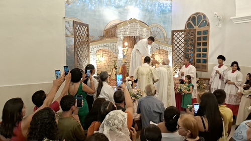 Na noite desta quarta-feira 14, foi celebrada Missa na Igreja Matriz de Santo Antônio que ficou literalmente tlotada pelos fieis que ao final da celebração, estiveram visitando o presepio que recebeu a imagem do Menino Jesus.