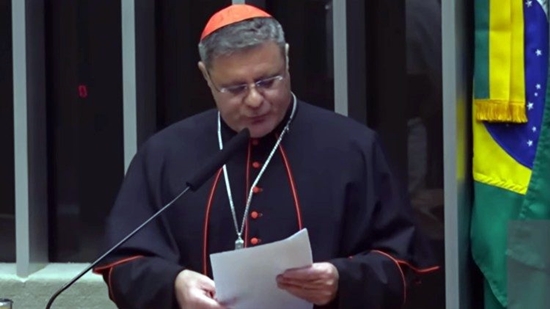 O cardeal Paulo Cezar Costa durante discurso na sessão solene que marcou os 200 anos de relações diplomáticas entre Brasil e Santa Sé, na Câmara dos Deputados.