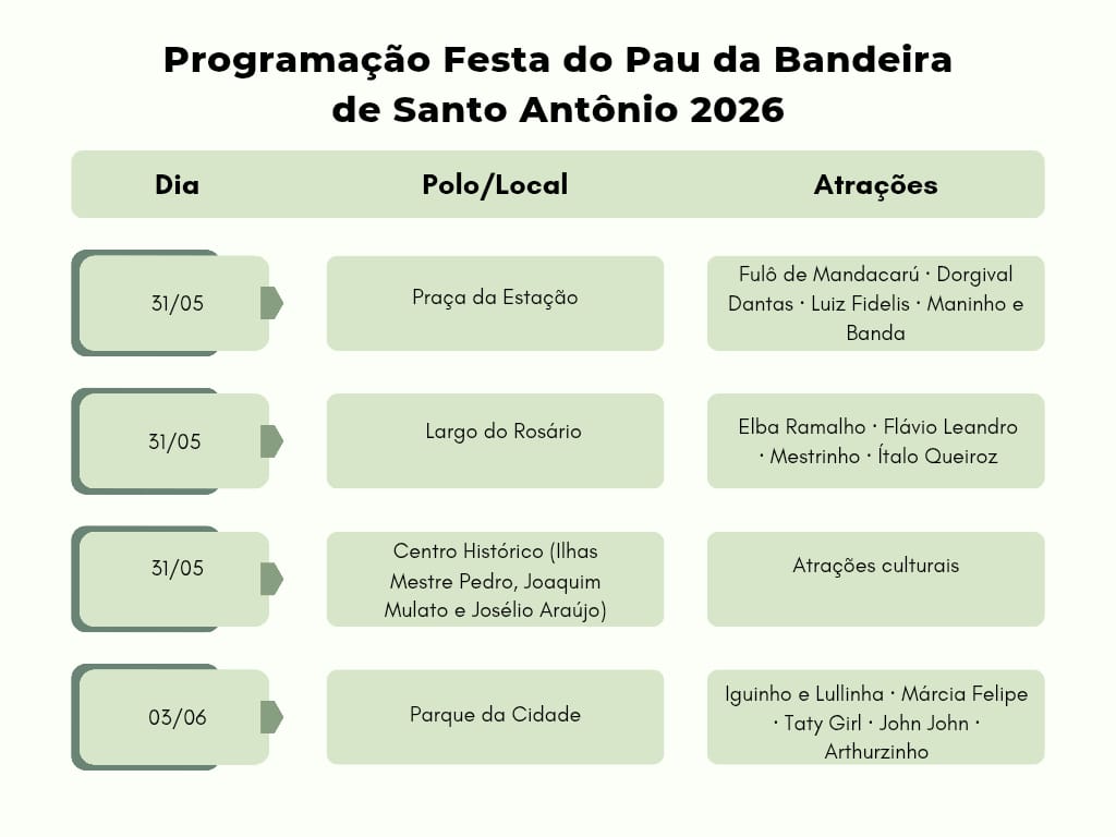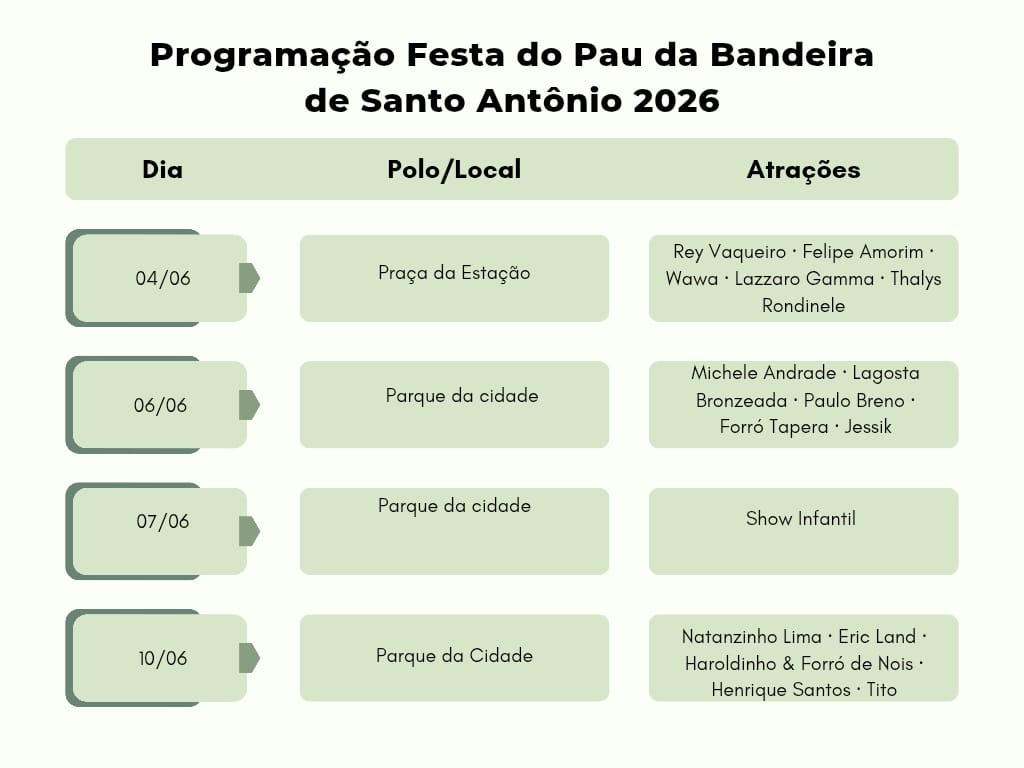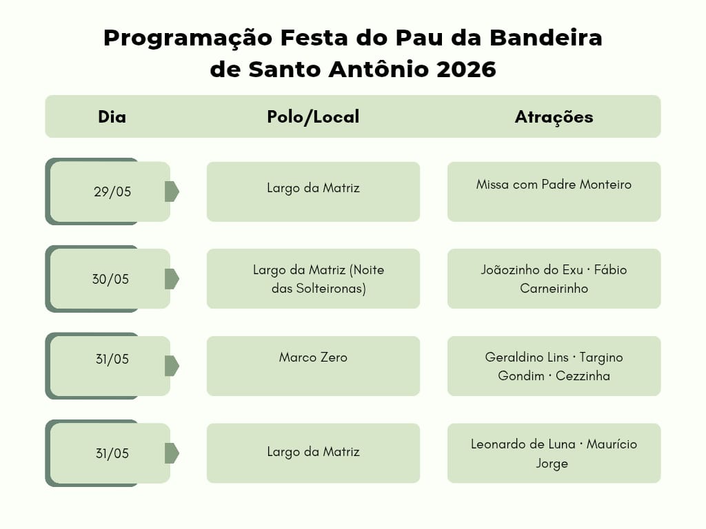 As festividades se iniciam em 15 de maio, com o corte do Pau da Bandeira, e vão até 13 de junho, incluindo apresentações culturais e celebrações religiosas. De acordo com o Prefeito Guilherme Saraiva, a expectativa este ano é que 500 mil pessoas compareçam às celebrações, um evento que impulsiona a economia local e regional em diversos setores.